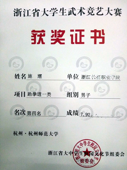 12月4日,由浙江省大中学生校园文化节组委会主办,杭州师范大学团委、杭州师范大学体育与健康学院承办的浙江省第二届大学生武术竞艺大赛在杭州师范大学举办。金华职院、浙理工大等20多所高校参加了本次比赛。我院参赛代表克服重重困难,取得佳绩。
