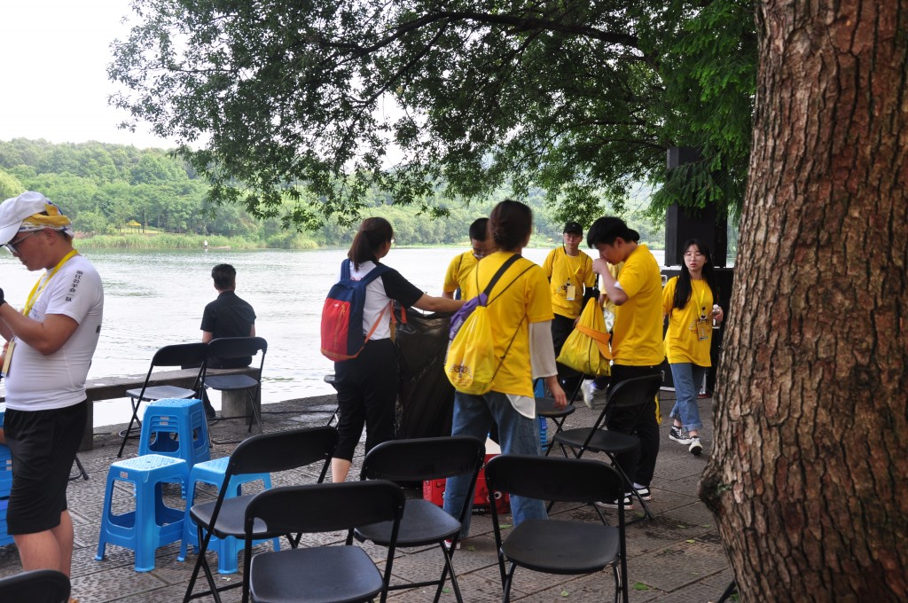 我校志愿者分为7个小组,分别是:主会场次序引导组、裁判组、检录组、机动组、引导和召集进场组、后勤组、沿线志愿者组。主会场次序引导组的志愿者负责维持开幕仪式和表演期间岸边的秩序。裁判组的志愿者负责辅助公羊会的裁判记录、报备和核对分数。检录组的志愿者是在水上浮台工作的,主要是保证参赛人员救生衣穿戴正确,等待参赛结束的龙舟,帮助参赛人员安全上下龙舟。机动组的志愿者负责救生衣的收集和发放工作。引导和召集进场组的志愿者负责赛前寻找所有参赛队伍,并且引导至参赛地点。后勤组志愿者辅助公羊会负责人为所有参赛队伍和志愿者发放午餐,引导参赛人员寄存物品。沿线志愿者负责在湖边维持观众观看比赛秩序,提醒观众远离危险水域以及指引主会场位置的工作。